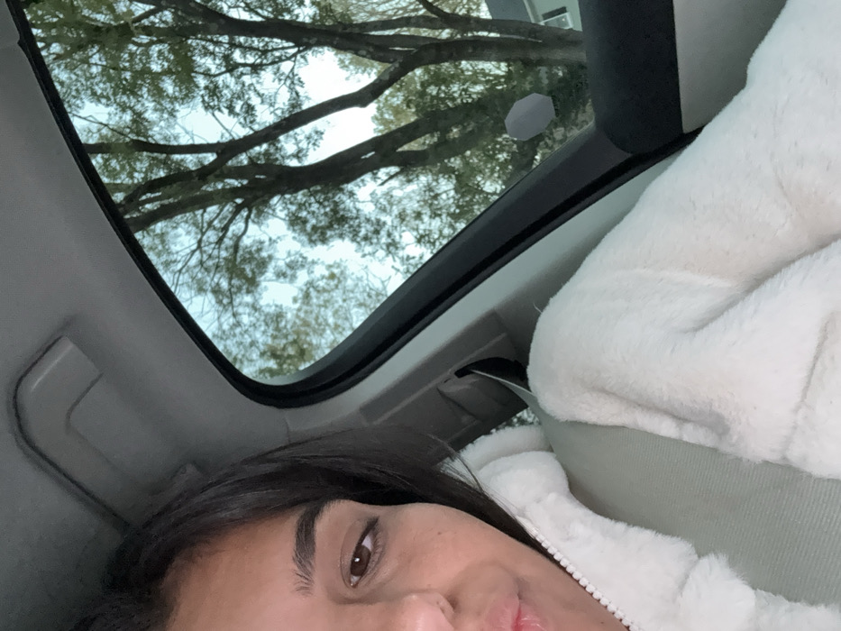 A female individual is partially visible in the left half of the image, seated in the front passenger seat of a vehicle in Lawrence Township, United States. She has dark hair and brown eyes, with her right eye, eyebrow, nose, and mouth visible. Her mouth is slightly pursed. She is wearing a white, fluffy, hooded jacket, zipped up, and a light-colored seatbelt is diagonally across her chest. The car's interior shows a gray headliner and a grab handle above the window. Through the vehicle's window, which occupies the right half of the frame, multiple deciduous trees with green foliage are visible against a light blue or overcast sky. A portion of a white house is discernible in the background, partially obscured by the trees. A small, light-colored, irregular sticker or reflection is present on the window glass, in front of the house. The scene appears to be static and takes place during daylight hours.