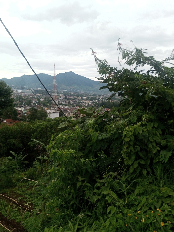 The image displays an elevated panoramic view of Bhupalpally, India, under an overcast sky. The foreground features dense green foliage comprising various shrubs and plants, with distinct yellow wildflowers in the lower right. A dark cable runs diagonally from the upper left into the midground. The midground reveals the city of Bhupalpally, characterized by numerous buildings with diverse roof colors, interspersed with trees. A tall red and white telecommunications tower stands prominently within the urban sprawl. In the background, a range of dark green, tree-covered mountains rises against the grey, cloudy sky. No individuals, specific actions, or interactions are visible.
