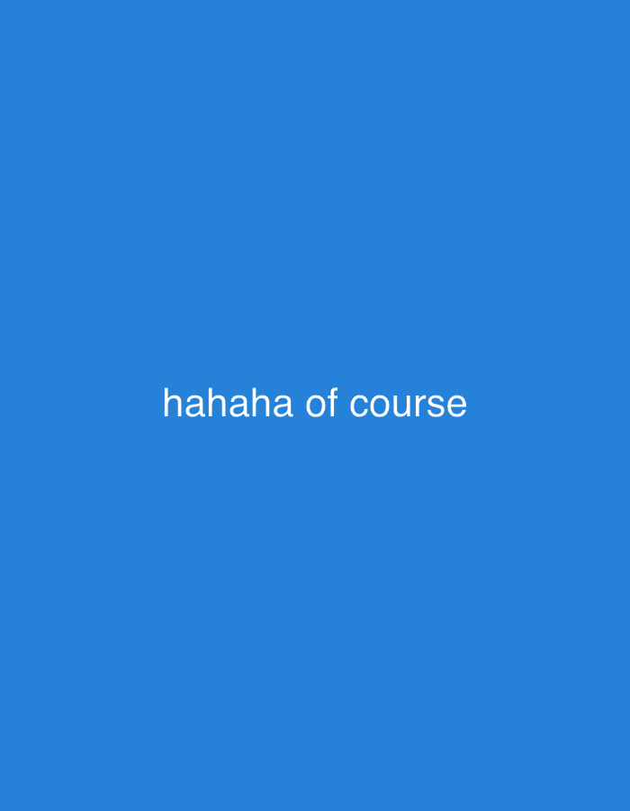 A flat blue background is displayed with centered white text that reads "hahaha of course"
