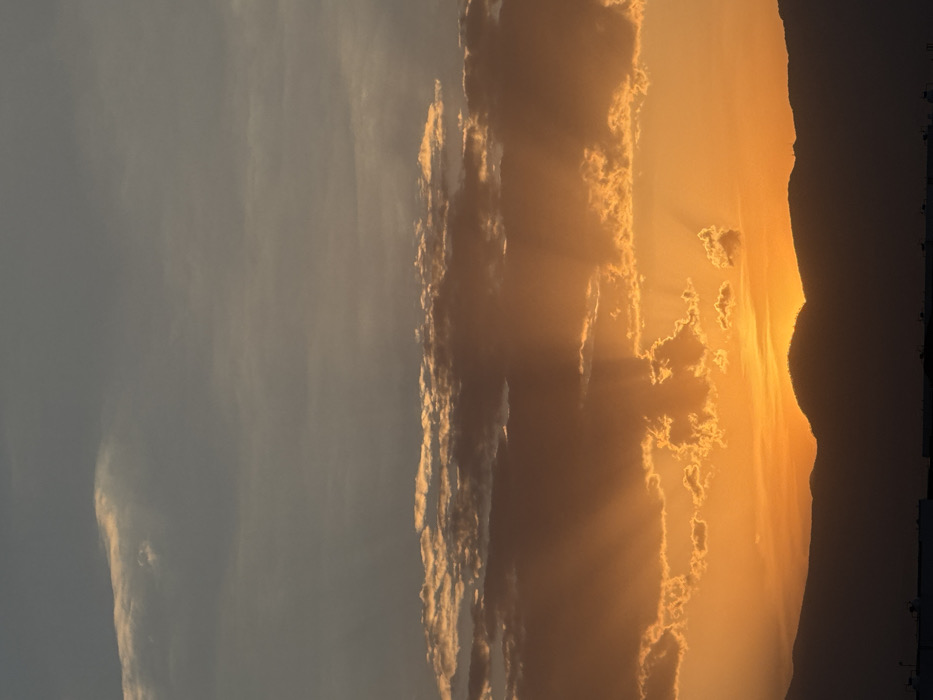 This image depicts a sunset over San Francisco Ocotlán, Mexico. The lower portion of the frame is dominated by a dark, silhouetted mountain range, which obscures the immediate horizon. Above the mountains, the sky is intensely illuminated with vibrant orange and yellow hues. Distinct crepuscular rays emanate upwards from the position of the unseen sun, extending through a band of clouds that are brightly lit from below. These lower clouds exhibit pronounced orange and yellow edges. Higher in the sky, the clouds transition to a muted grey-blue, with scattered, less defined formations. The uppermost section of the sky is a clearer, lighter grey-blue. At the very bottom of the frame, a dark, horizontal, indistinct line represents the silhouette of urban rooftops, indicating an elevated viewpoint over the city. No people, animals, or specific identifiable objects are present within the primary natural landscape.