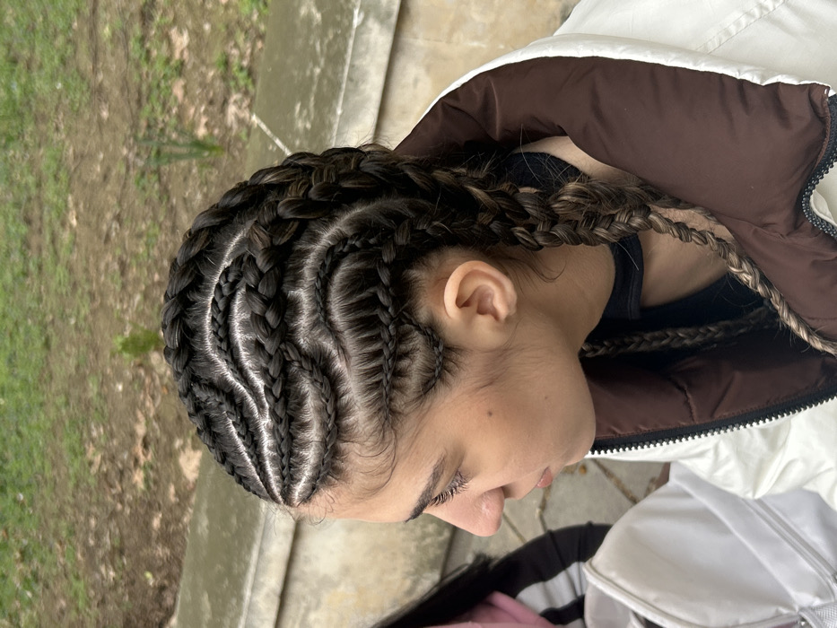 The scene is set in an outdoor park or garden area within Plovdiv, Bulgaria. A young individual is depicted in a left-profile, close-up view, appearing seated or stationary. The subject possesses dark brown hair meticulously styled into numerous tight cornrows, which form distinct wavy patterns across the scalp before transitioning into larger, multi-toned braids that drape over the left shoulder. Lighter brown highlights are visible within these braids. The individual is dressed in a white puffer jacket, revealing a brown inner lining along the open zipper. Beneath the jacket, a black garment with a wide, cutout neckline is visible. The subject's face maintains a neutral expression, featuring visible eyelashes and defined eyebrows. The left ear is bare. In the blurred background, a light-colored concrete or stone barrier is discernible, with green foliage and patches of earth beyond it. A second, out-of-focus individual, wearing a pink garment, is partially visible on the far left of the frame.