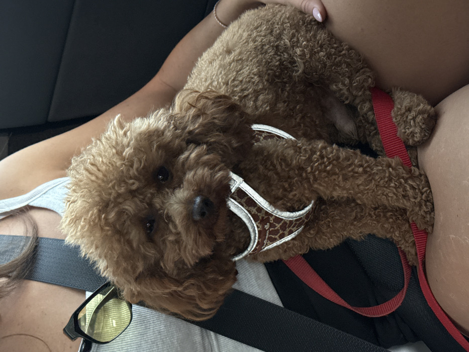 The image presents a close-up view of a small, brown, curly-haired dog seated on a human's lap within what appears to be a vehicle