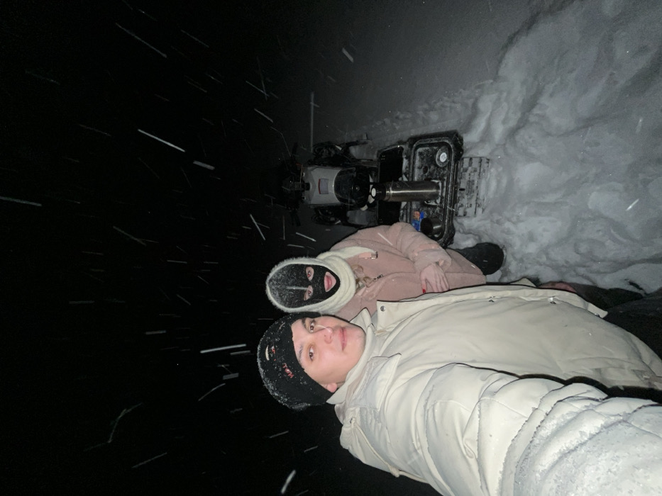 In a snowy, dark outdoor scene, two people pose for a selfie. The person in the foreground wears a black beanie and a light-colored jacket. Behind them, another person wears a black balaclava and a light pink jacket with a white scarf. A snowblower is partially visible in the background, surrounded by a large pile of snow on the right side. Snowflakes are visible throughout the frame.