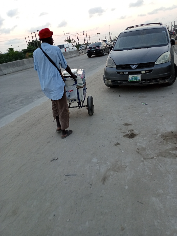 A vendor wearing a red hat and light blue shirt pulls a wheeled cooler cart. He is on a grey road shoulder, near a line of vehicles. A grey minivan dominates the foreground. Its license plate reads "AJA-499AE". Other cars are behind it. Overhead power lines are visible in the distance, suggesting an urban setting. The sky is pale and overcast, hinting at either dusk or dawn.