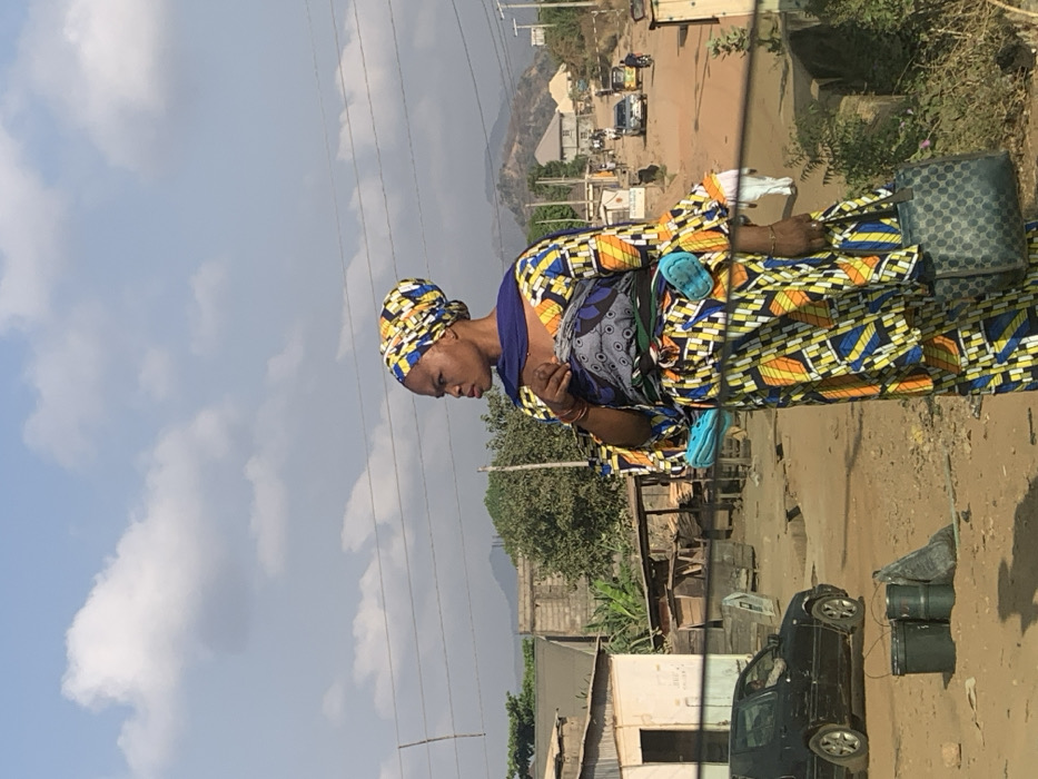 This image depicts an outdoor daytime scene in Abobo, Nigeria, under a partly cloudy sky. The primary subject is a woman positioned in the right foreground, standing and looking towards her left. She wears a vibrant, multi-colored geometric pattern dress and a matching headwrap. A dark blue fabric is visible around her neck, and a dark, patterned baby carrier cloth is wrapped across her chest, with small blue baby sandals attached to her left side. She wears reddish-brown bracelets on her left wrist and holds a dark, patterned handbag in her right hand; her left hand is slightly raised with fingers curled. The ground is unpaved and dusty, with shadows indicating bright sunlight from the right. In the mid-ground to the left, a dark-colored sedan is partially visible on the unpaved surface, with two green buckets and a dark bag resting on the ground nearby. Behind the car is a small, light-colored building with a corrugated metal roof. An unpaved road extends into the background, where several vehicles, including cars and a yellow motorized tricycle, are visible, along with indistinct human figures. Various buildings, some appearing to be concrete block structures, line the road. Sparse trees and bushes are scattered throughout the background, and undulating hills or mountains are discernible on the distant horizon. Multiple utility lines are visible crossing the upper portion of the frame.