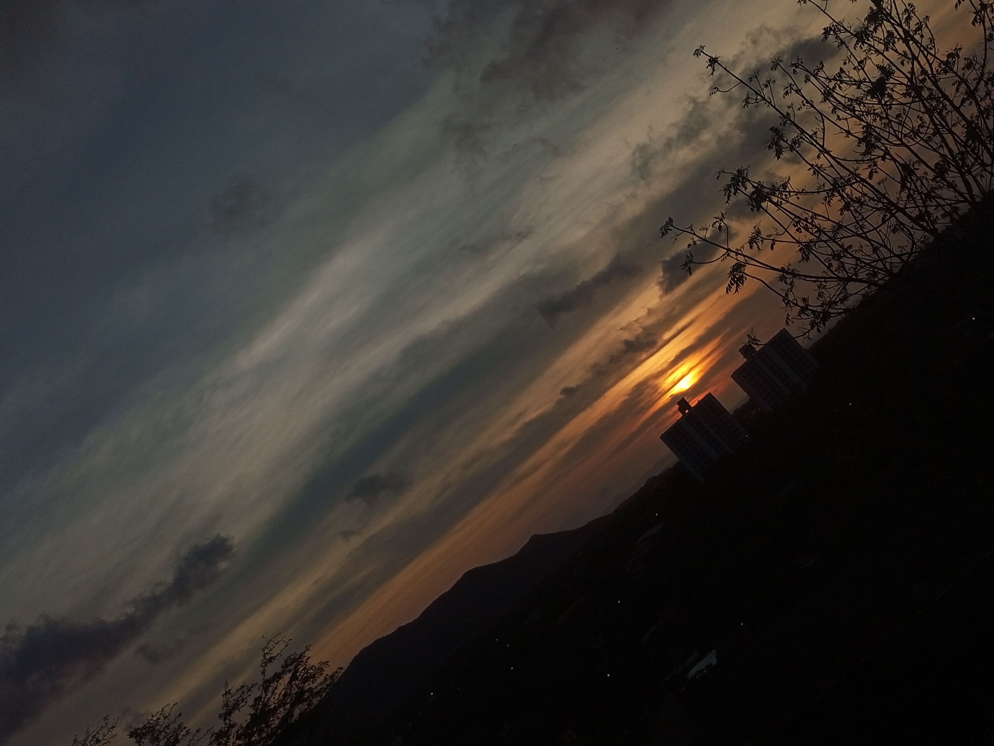 sunset in Juan Griego, Venezuela. The sun is setting behind two buildings in the distance, partially obscured by a mountain range. The sky is streaked with orange and gray clouds. A bare tree branch is visible in the upper right corner of the image, and another is present on the bottom left. The foreground is dark, making it difficult to discern details.
