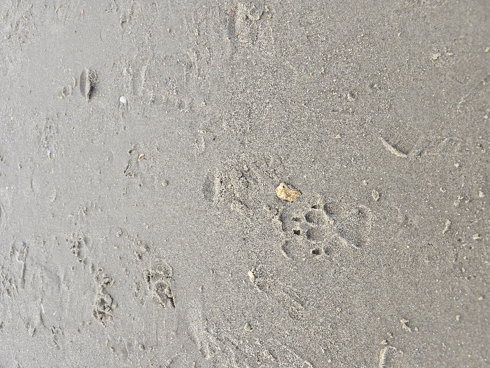 The image displays a close-up view of light grey-brown sand on a beach in Poole, United Kingdom. The sandy surface is marked by numerous impressions, including multiple animal paw prints; one distinct print, consistent with a canine or feline, is centrally located, showing clear toe and heel pad indentations. Additional, less defined paw prints are scattered across the frame. Human footprints, some partial and indistinct, are also visible, notably a partial impression in the upper right quadrant. An irregularly shaped, yellowish-brown object, approximately 2-3 cm in its longest dimension, rests above and slightly to the right of the central distinct paw print. Scattered small white fragments, consistent with shell debris, along with other granular detritus, are interspersed throughout the sand. The scene documents the passage of both human and animal subjects across the sandy terrain.