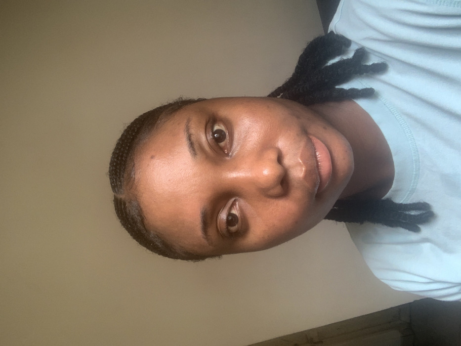 The image displays a close-up portrait of a single female subject, located in the city of Abuja, Nigeria. The individual faces the camera directly with a neutral expression. She exhibits medium-dark brown skin, dark brown eyes, and full, lightly parted lips with a natural sheen. Her hair is styled in dark cornrow braids on the scalp, transitioning into individual twists/braids that frame her face and are visible over her shoulders. A small, dark epidermal lesion is present on her forehead, superior to the left supraorbital ridge. The subject is wearing a light blue, short-sleeved crew-neck garment. The background consists of a plain, light brown interior wall, illuminated by a soft, diffuse light source. No other individuals or interactions are depicted.