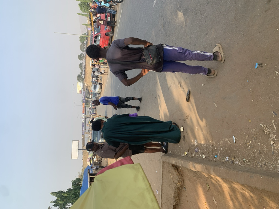 Several people stand on a street near traffic and a roadside. A man in a gray shirt and purple pants with white stripes faces away. Another man wears a blue shirt. One person is draped in a long, dark green garment. Others are partially visible. A billboard stands in the background. There is litter on the ground along the edge of the road. The sky is overcast. A few tents or canopies appear along the roadside.