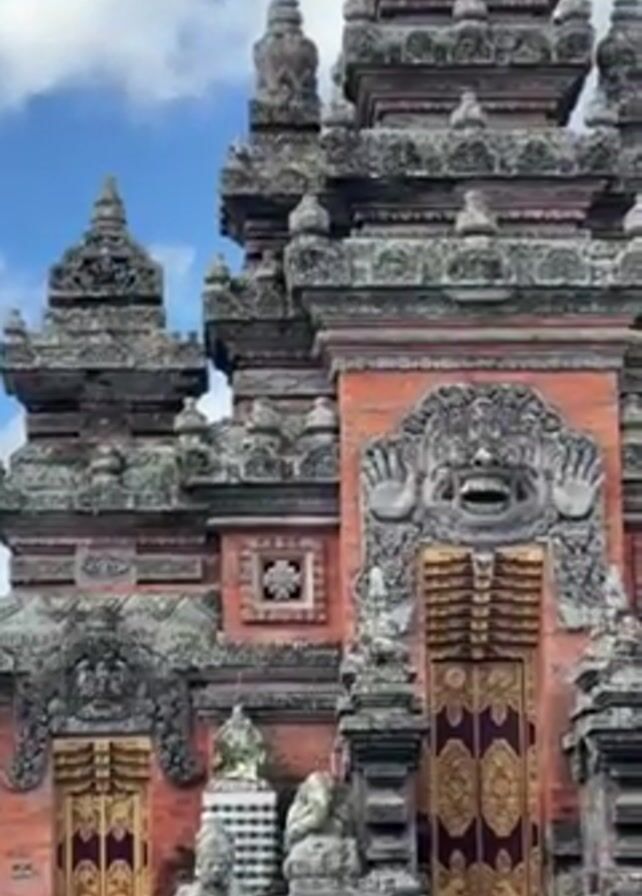 close-up of an ornate, ancient-looking stone structure against a partly cloudy sky. The structure is mainly constructed of reddish-brown brick and gray stone, and it is covered in intricate carvings. There are several layers of the structure, tapering upwards to a central tower-like point. The entrance to the structure features two golden doors with maroon accents and a fearsome, carved face with extended hands directly above. Statues of figures are placed on the lower level. The camera slowly pans upwards, showcasing the intricate details of the architecture. Voices can be heard in the background.