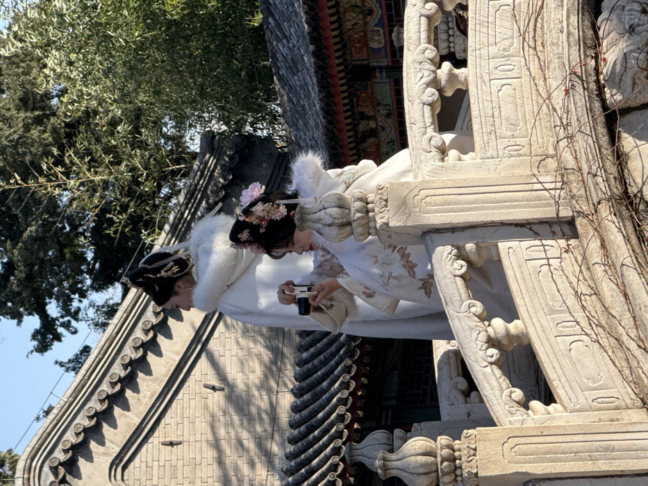 Two women in traditional Hanfu attire stand near an ornate stone structure with intricate carvings. One woman focuses on a camera she is holding. The second woman is next to her, with both facing downwards. The structure, possibly a bridge railing, is partly covered by thin vines. Beyond the women and structure, sections of tiled roofs and leafy trees are visible. The sky is light blue.