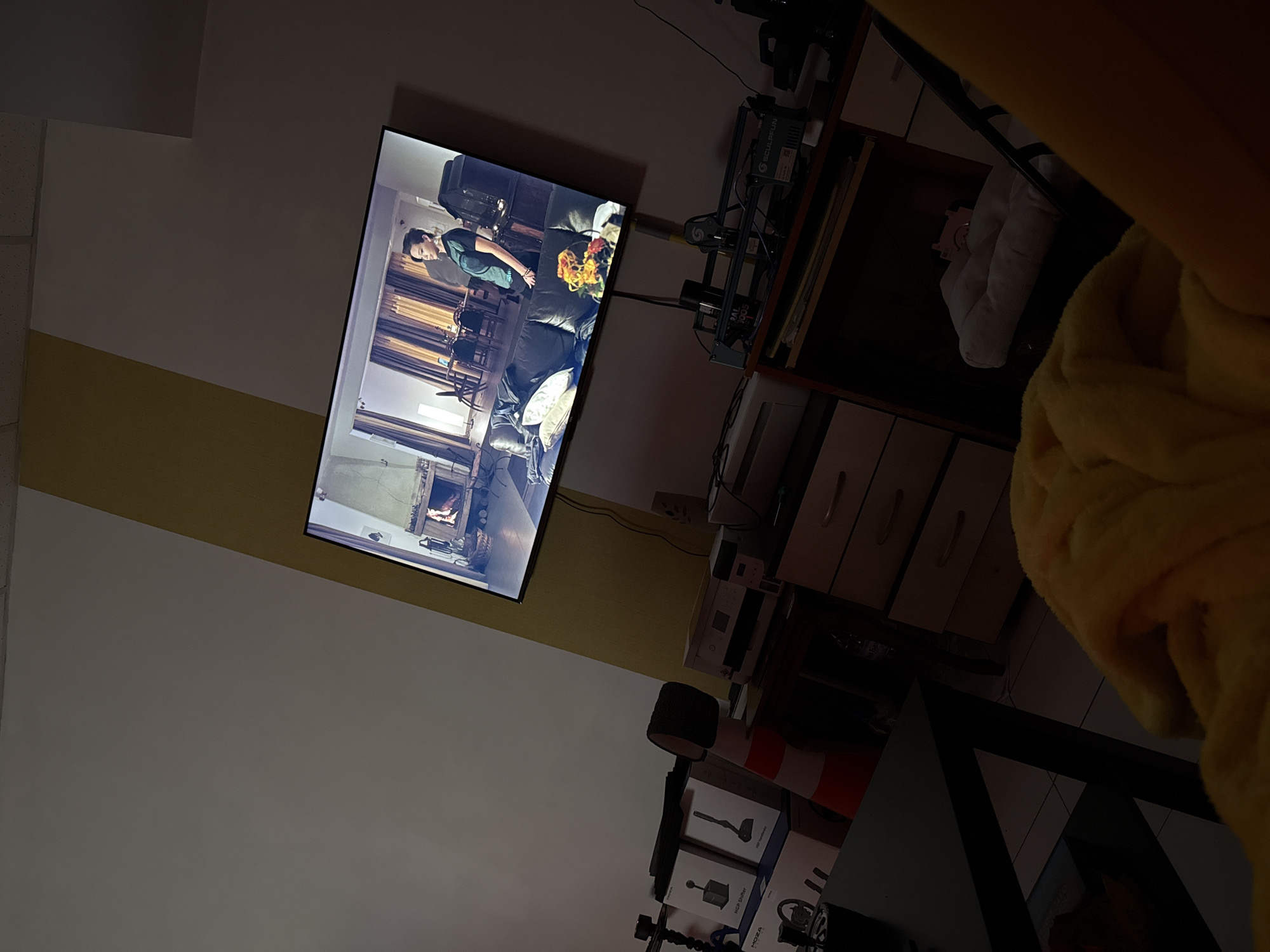 A television screen displays a scene with a person standing near a couch in what appears to be a living room setting with a fireplace. The television is mounted on a wall in an indoor environment. To the right of the screen is a desk with multiple objects including a 3D printer and a set of drawers. Below the desk is a collection of boxed items. A table with a black surface is in the foreground, partially obscured by a yellow garment. The location is likely indoors, possibly a residence in Sofia, Bulgaria, given the query parameters.