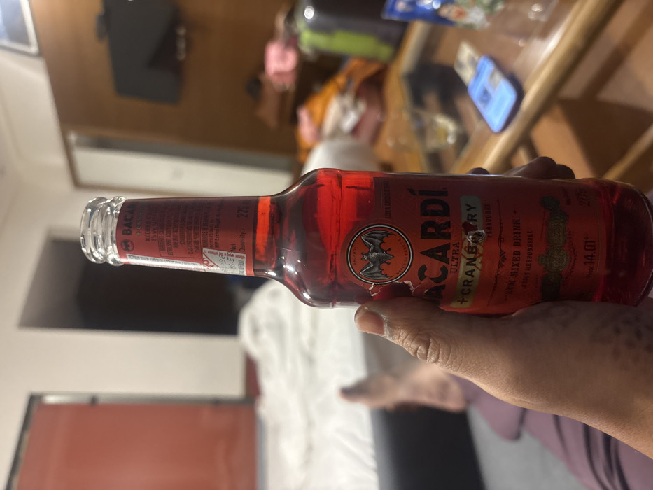 A person holds a red Bacardi Ultra Cranberry flavored pre-mixed drink in their hand. The label is mostly visible, displaying the brand name, flavor, and alcohol content (14.01%). The bottle is upright, with the clear glass neck visible. The background shows a blurred indoor setting, including a table and other items. The image appears to be casually captured, focusing on the product being held.