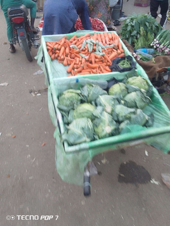 A street vendor's cart displays a bounty of fresh produce. The top level is piled high with vibrant orange carrots and pale green cucumbers. Below, heads of cabbage fill the lower level. Green leafy vegetables and red peppers are visible in the background, completing the colorful array of goods for sale. A motorcycle and people are also visible around the cart.