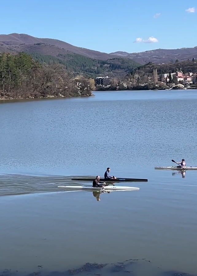 three people in kayaks on a lake. The two kayaks in the foreground are closer to the shoreline and appear to be stationary or moving very slowly. The person in the first kayak is wearing dark clothing. The person in the second kayak appears to be wearing blue. The third kayak, further away, has a person wearing a pink top paddling. The water is calm with slight ripples from the kayaks. The sky is clear blue with a few clouds. In the background, there are mountains and trees, and a town or village can be seen on the far shore. There is also trash along the shoreline in the foreground.