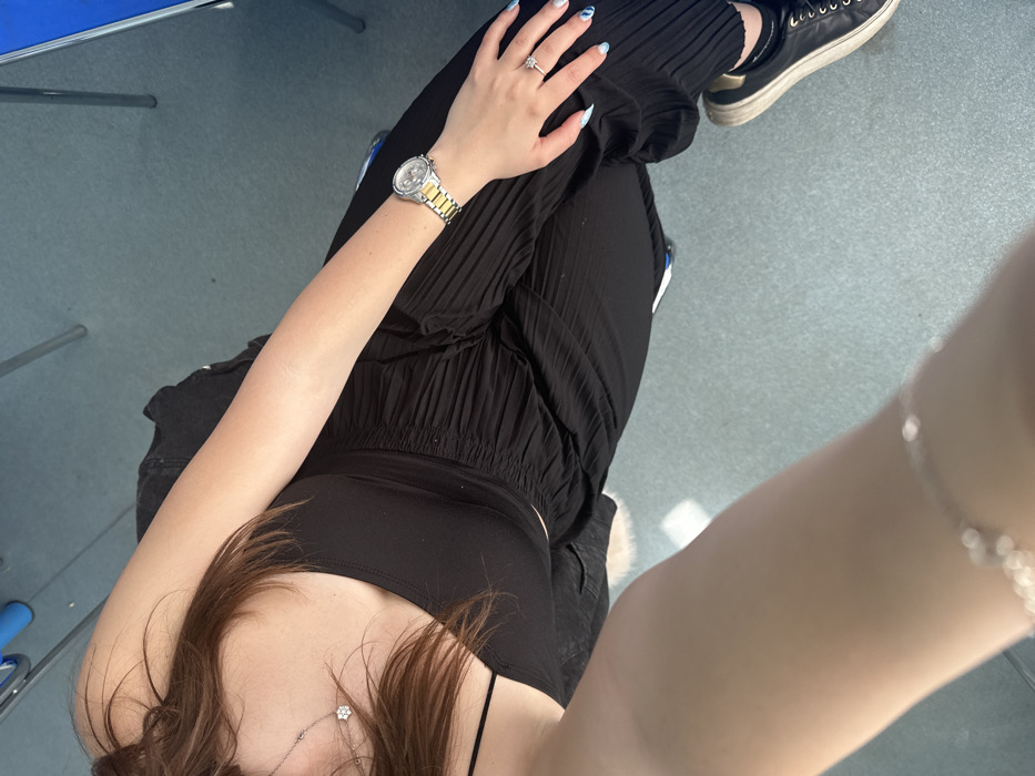 An overhead, downward-angle photograph depicts a person seated indoors in Vratsa, Bulgaria. The subject is partially visible, showing the upper torso, arms, and legs. They are wearing a black tank top, black pleated wide-leg pants, and black lace-up sneakers with white soles. A two-tone silver and gold wristwatch is worn on the right wrist. The right hand displays a silver ring with a clear central stone on the ring finger, and fingernails are painted with a blue and white patterned design. A delicate silver-colored necklace with a small, flower-shaped pendant is visible on the chest. A silver-colored bracelet is present on the left wrist. Long, brown hair is visible across the subject's left shoulder and chest. The flooring is a light blue-grey material. In the background, metal furniture legs and a blue surface, likely a table or chair, are partially visible. A bright light source creates a glare on the floor and the subject's left arm.