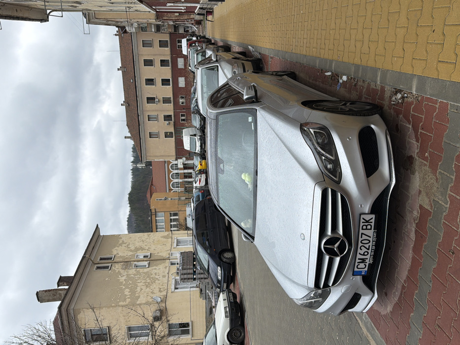 The image depicts an urban street scene in Rudozem, Bulgaria, under an overcast sky. In the foreground, a silver Mercedes-Benz E-Class sedan (W212 facelift model) with Bulgarian license plate "CM 6207 BK" is parked on a red and yellow brick paver sidewalk, facing away from the viewer. Its exterior is covered in water droplets. Two light-colored plush toys are visible on the dashboard through the windshield. Litter is present on the sidewalk near the vehicle's right front tire. Behind the Mercedes, a row of approximately ten diverse vehicles, including sedans, a dark minivan, and a white commercial van, are parked parallel to the street. A bright yellow car is partially visible further down the parking area. To the left, a multi-story building with a faded, peeling yellow facade and a brown roof stands prominently. It features multiple windows and a visible brick chimney on its roofline. An area at its base is partially obscured by a metal fence, suggesting construction or renovation, with stacked pallets visible. In the mid-background, another multi-story building with a light beige facade and a brown roof is visible, featuring numerous windows and what appears to be a basketball hoop structure further to its right. Dense evergreen forests cover hills in the far background under a uniform gray, cloudy sky. No individuals are visible in the scene.