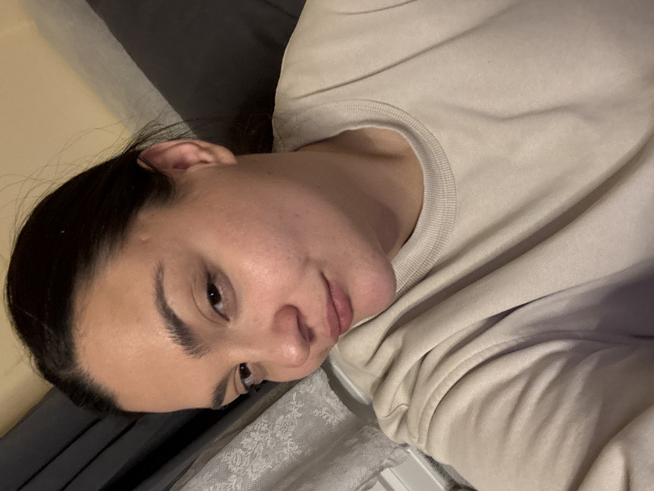 A female individual is depicted in a close-up, headshot-style portrait within an indoor setting. The subject, appearing to be an adult, has dark hair pulled back from her face, dark eyes, and full lips, displaying a subtle, closed-mouth smile. Her skin has a soft sheen, and a small, round indentation is visible on her forehead above her right eyebrow. She is wearing a plain, light beige or off-white long-sleeved crew-neck sweatshirt. The background is out of focus. To the left of the subject, a dark grey curtain is partially visible, behind which a white, possibly lace-patterned curtain or sheer fabric is discernible, suggesting the presence of a window. To the right of the subject, a dark grey or black object, possibly a pillow or furniture upholstery, is present. The lighting is soft and even, consistent with an interior environment. There are no discernible visual elements within the image to identify the specific location as Sofia, Bulgaria.