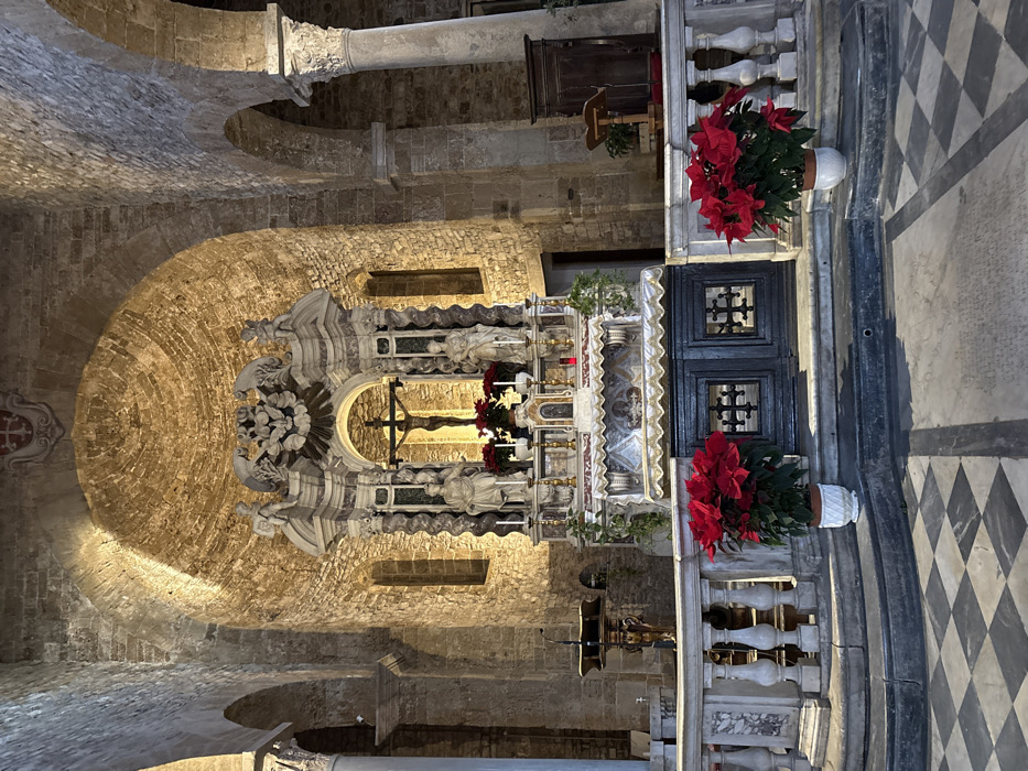 The image displays the interior of the Basilica di San Piero a Grado, located just outside the city of Pisa, Italy. The central focus is a multi-tiered Baroque altar situated within a Romanesque apse. The altar, crafted from multicolored marble, features a crucifix with the figure of Christ. This is flanked by two white marble statues depicting robed figures, possibly saints. The altar structure is ornate, including spiral columns, decorative carvings, and a crest-like element at the top. The altar table is draped with a white cloth trimmed with gold, displaying several lit candles and smaller decorative items. Directly in front of the altar, additional poinsettia plants with red bracts are visible. The apse wall and vaulted ceiling are constructed from unmortared rough-hewn light-brown stone blocks, illuminated by artificial lighting that creates a warm glow. Three narrow, arched windows punctuate the apse wall. High on the upper left wall, a faded red and white heraldic shield is affixed. A marble balustrade with intricate balusters defines the elevated altar area from the foreground's black and white checkered floor. Two large potted poinsettia plants in white, textured planters are positioned on the steps leading to the altar area, one on each side. To the left of the altar, a wooden lectern with an ornate base stands on a side platform. To the right, a darker wooden furnishing resembling a prayer stand or small cabinet is visible. Architectural elements, including substantial stone columns with carved capitals and round arches, support the nave structure and are visible on the periphery of the scene. No individuals are present within the depicted scene.