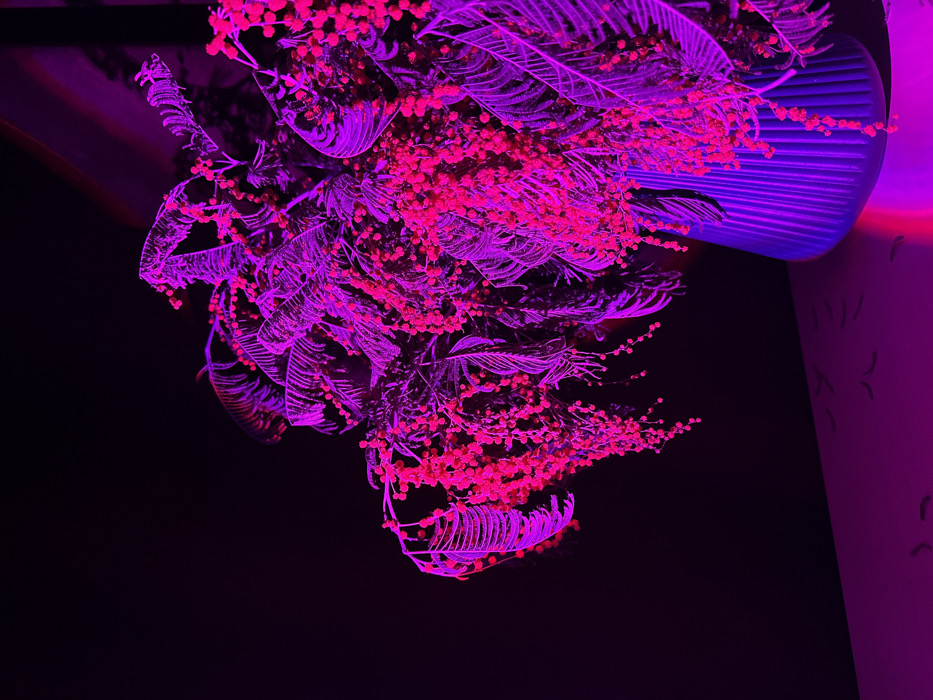 A dazzling display features vibrant pink flora against a stark black background. Light illuminates the plants, highlighting berry clusters and feathery leaves. The arrangement extends towards an unseen light source, casting intricate shadows below. The scene merges dark contrast with bright, lively color, creating a visually striking composition.