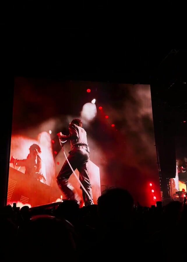 A concert is taking place. A singer wearing a leather jacket and pants is performing on stage. The stage is brightly lit with red lights and smoke. A large screen behind the singer shows a close-up of the singer's back. The audience is silhouetted in the foreground.