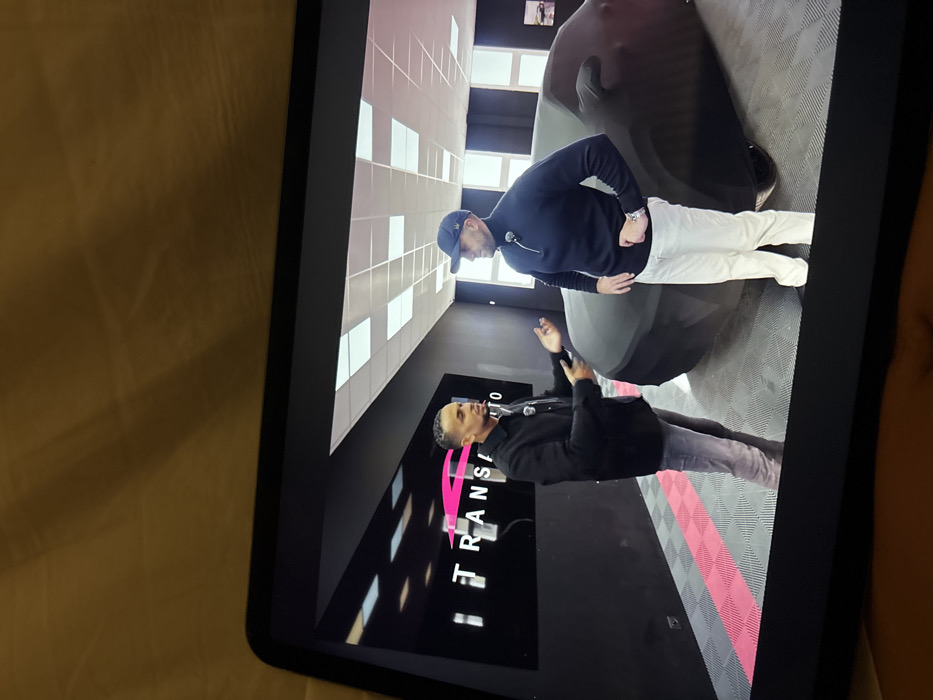 A tablet screen displays a scene with two men in an indoor setting. The first man is wearing a blue cap, dark jacket, and white pants. The second man is wearing a black jacket and gray jeans, gesturing with his hand. The background features a black wall with the word "TRANS" and a logo with pink lines. A grey and pink striped floor is visible. The lighting is bright, and the perspective is slightly tilted.