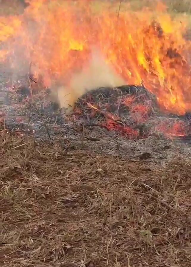 The video depicts a burning pile of dry brush and debris in a field of dry grass