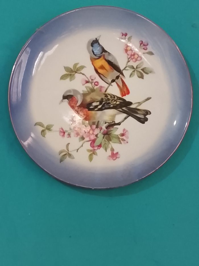A circular plate, primarily white in the center, features two birds perched among flowering branches