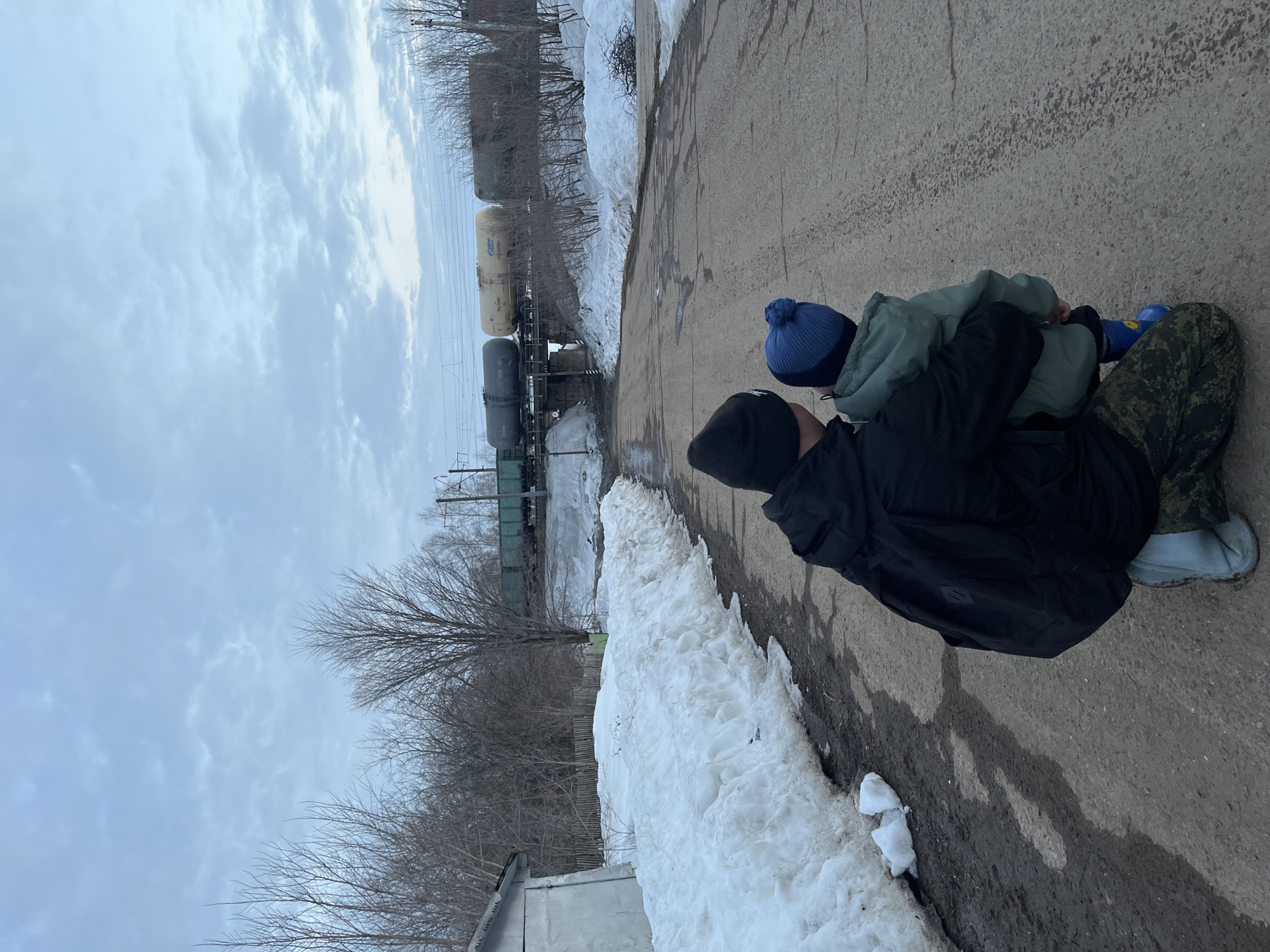 An outdoor scene in Павловка, Russia, depicts two individuals observed from behind on a worn paved road under an overcast sky. In the foreground, an adult, dressed in a black winter jacket, black beanie, and camouflage trousers, crouches or kneels, embracing a small child. The child wears a blue pom-pom beanie, a teal-colored winter suit, and blue boots. Both individuals face away from the viewer, looking towards a railway bridge. To their left, a substantial, partially melted snowdrift lines the edge of the road, bordered by a small, light-colored building with a dark roof. Bare deciduous trees and shrubs are visible behind the snowdrift and building. In the midground, a railway line crosses over a concrete or stone bridge. A train, consisting of multiple tanker cars (including dark grey, beige with "SGAT" visible, and a green freight car), is present on the tracks above the bridge. The surrounding landscape features additional bare trees, utility poles with power lines, and distant structures, indicating a semi-rural or industrial fringe area. The ground shows signs of melting snow, with patches of dark, wet earth and water.