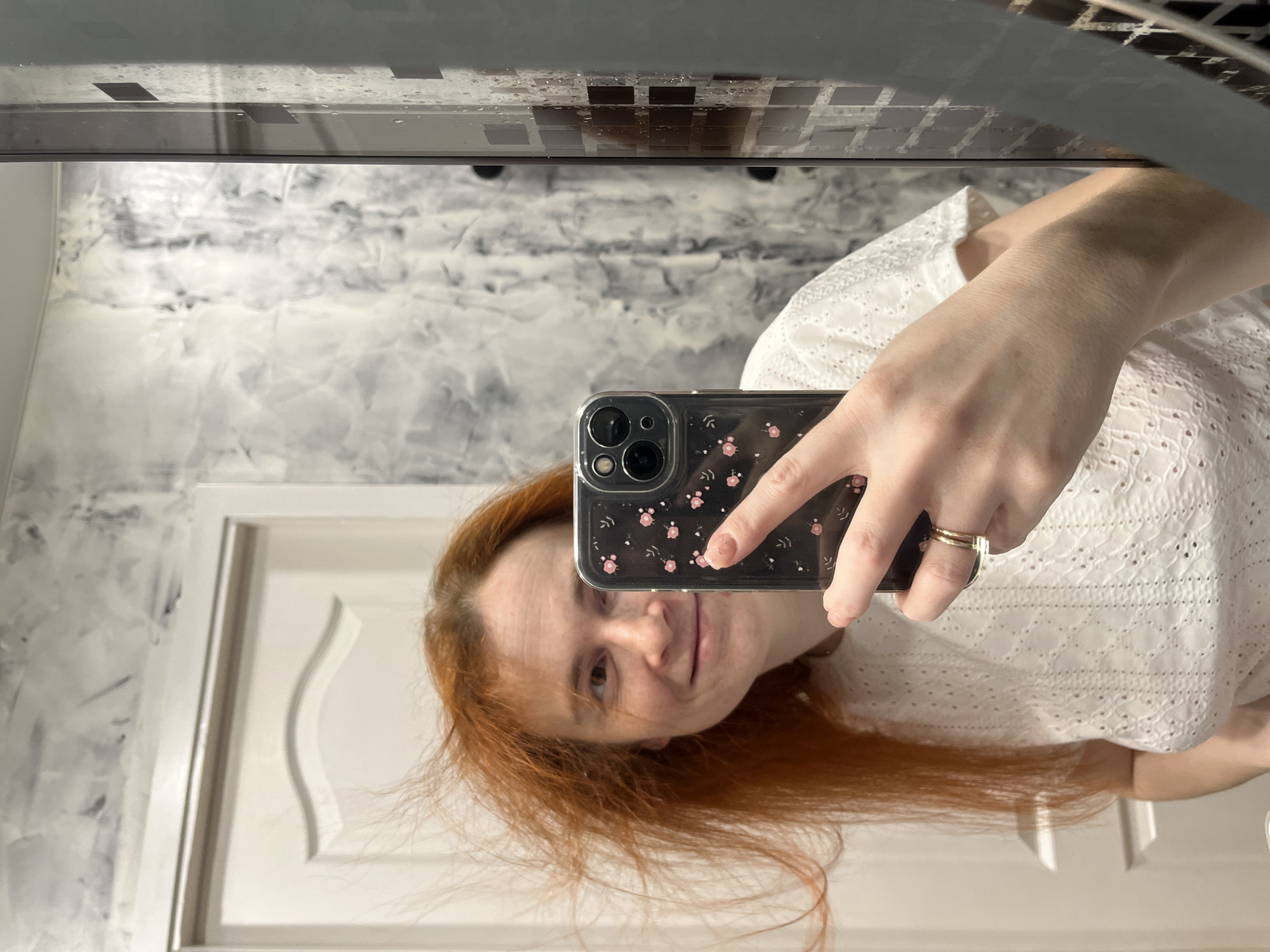 A red-haired woman is taking a selfie in a bathroom. She is wearing a white, lacy blouse and holding a cell phone with a floral case. The bathroom has a marbled wall and a white door. The location is Chaikovsky, Russia.