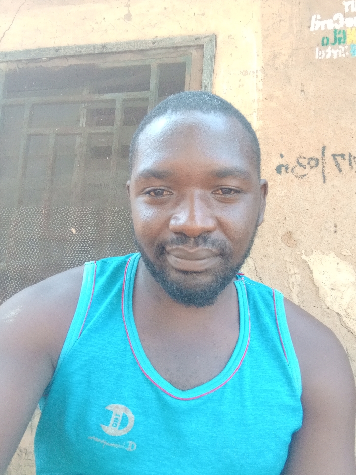 An adult male is depicted outdoors in Gudi, Nigeria, positioned against a weathered light brown building wall