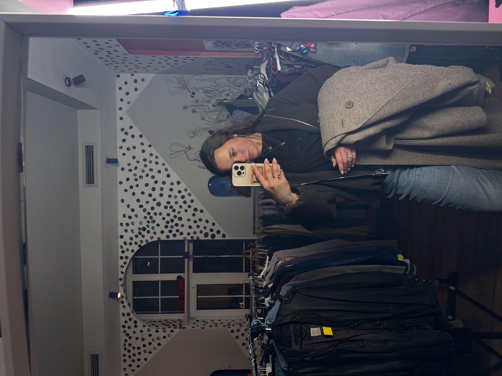 A woman is taking a selfie in a mirror in what appears to be a clothing store in Sofia, Bulgaria. She's holding a gold-colored iPhone, and her hand with manicured nails and a ring is visible. She is wearing a dark-colored, shiny-textured jacket and a gold necklace. A grey wool coat is draped over her shoulder. In the background, there are clothes racks filled with garments, and behind her is a wall decorated with polka dots and floral designs. A window is visible in the background. The overall lighting in the store is dim.