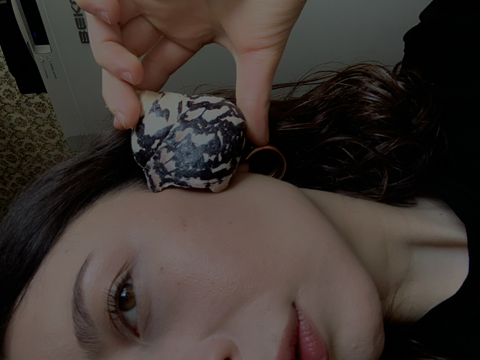 The scene depicts a close-up of an individual's right profile, located in Yerevan, Armenia. The person has light skin, a visible brown eye with long eyelashes, a defined eyebrow, and dark, wavy hair falling to the shoulder. A faint reddish mark is present on the right cheek. A copper-colored hoop earring is worn in the right earlobe. An individual's hand, with unpainted nails, holds a large, irregularly shaped seashell against the person's right ear and cheek. The seashell is predominantly cream-colored with extensive dark, mottled, and branching patterns. The person wears a black garment, visible around the neck and shoulder. The background features patterned wallpaper on the upper left and a silver electronic device, partially branded "BEKO," with controls and an illuminated indicator light, on the upper right.