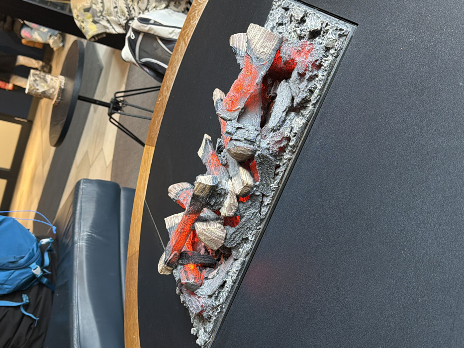 - "An indoor scene in Dresden, Germany, displays a rectangular artificial fireplace insert positioned centrally on a dark, circular tabletop with a visible brown wooden edge" by FM-rFq5f2, licensed under CC BY 4.0
