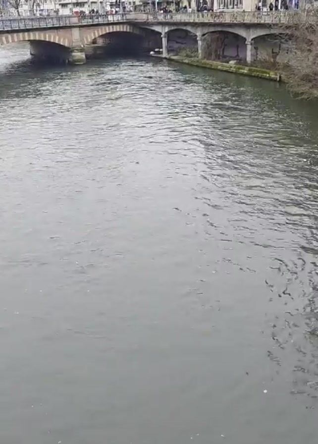 river flowing under a bridge with buildings on the opposite bank. The water is grayish and slightly choppy. The bridge is made of stone and has arches. People are walking on the bridge. Buildings are visible in the background. The day appears overcast.