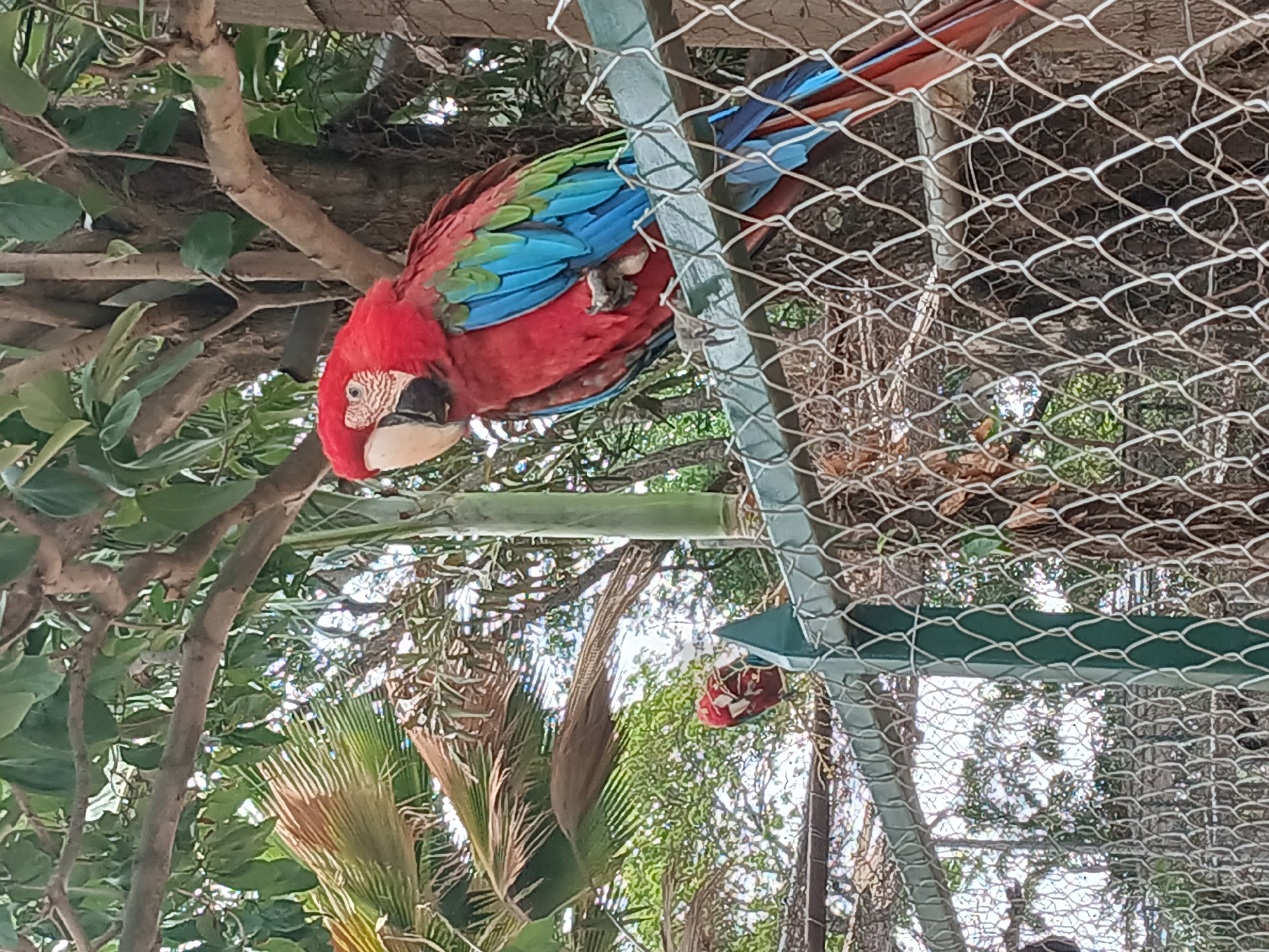 A red and blue macaw is perched on a wire fence. The macaw is facing left and slightly down, with its head visible and body partly obscured by the fence. The fence is a light gray color and has a wire mesh pattern. There are trees and foliage visible in the background, creating a natural environment around the fence. A second macaw is partially visible in the bottom center right of the image. The location is Unknown, Unknown.
