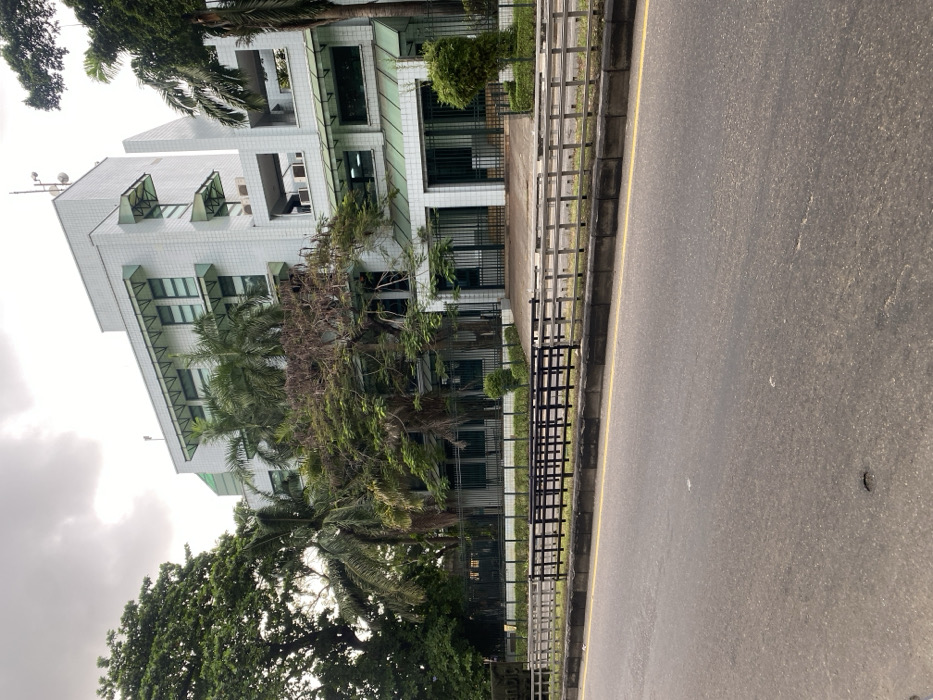 A multi-story white building with green accents is partially obscured by trees, including palms. The building features multiple windows and protruding balconies. A dark metal fence runs parallel to a road, separating the building's grounds from the pavement. The pavement takes up a large part of the right side of the picture, with a single, small, light-colored object visible on its surface. The sky is overcast.