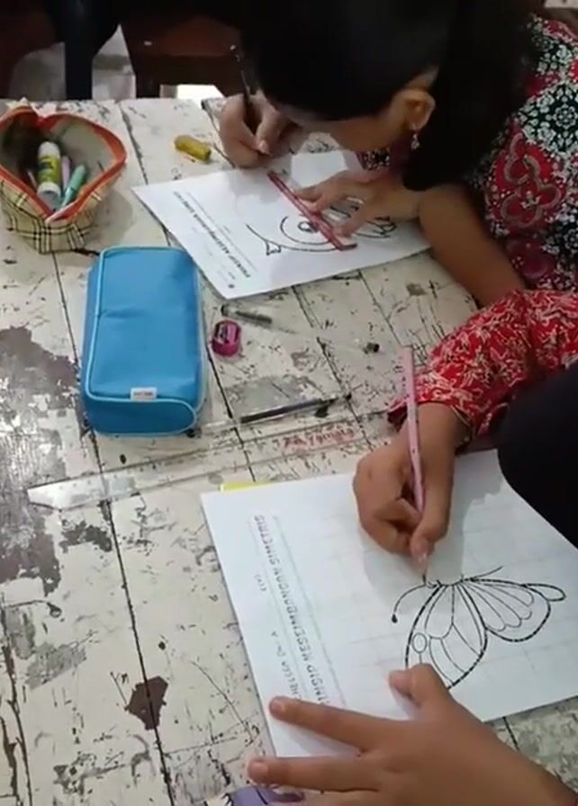 Two young girls sit at a worn, wooden table and draw on papers. One girl, dressed in a red floral shirt, uses a pink pencil to draw a butterfly on a grid pattern. The other girl, wearing a similar red patterned shirt, uses a ruler and pencil to draw an image of a cartoon face. Art supplies such as crayons, a pencil box, sharpener, and other tools are scattered on the table. The environment is indoors and appears to be an educational setting.