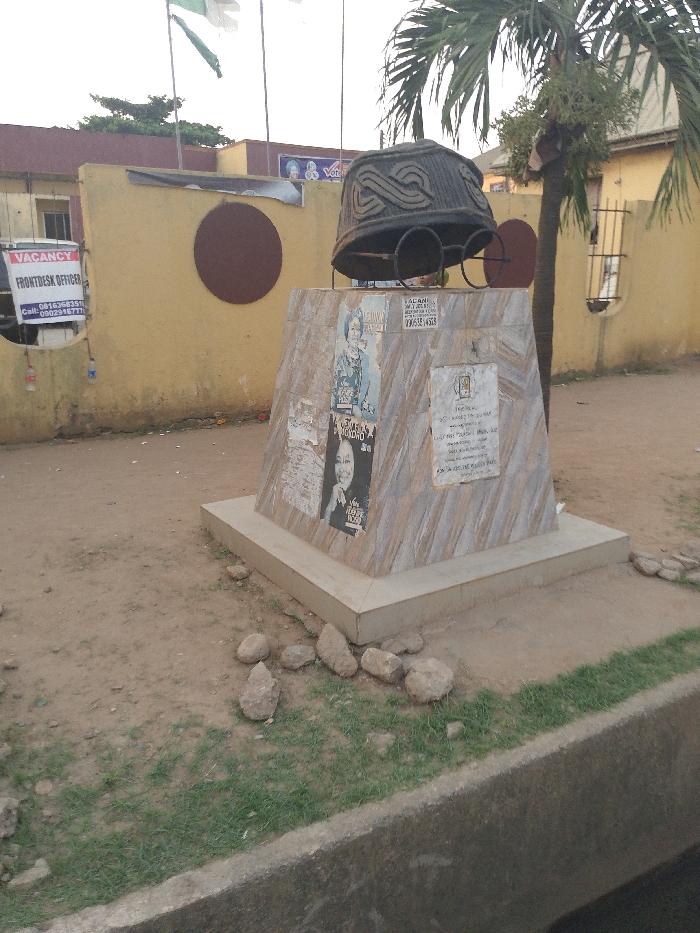 An outdoor scene shows a monument with a large hat and glasses atop a marble-like base. The base is adorned with posters and plaques. Several rocks are scattered around its base. Behind the monument is a yellow wall with a dark circle on it and a "Vacancy" sign hanging to the left. A palm tree stands to the right, partly obscuring a building in the background. Nigerian flags are displayed on poles in the distance.