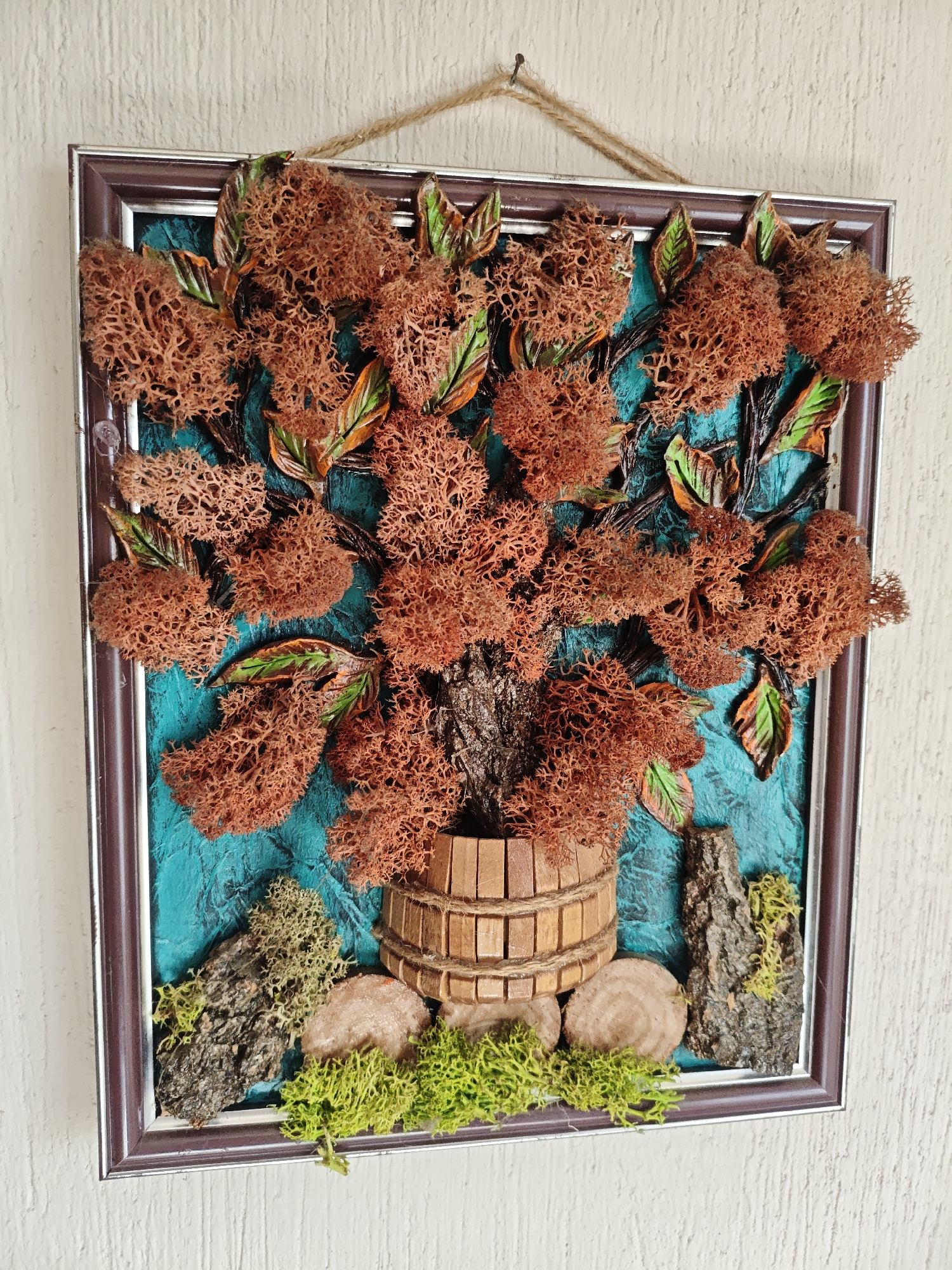 A framed piece of artwork depicting a tree in a pot hangs on a white textured wall. The artwork features a brown frame with a silver inner border. The background is a textured teal color. The tree's trunk is made of dark brown material and is planted in a small wooden pot. The tree's foliage consists of clusters of dried, reddish-brown moss. The branches are visible and are dark brown. The leaves are painted green and brown. The base of the tree is decorated with green moss, two round stones, and two pieces of bark. The artwork hangs from a brown twine loop attached to the top corners of the frame. The location is Unknown, Unknown.