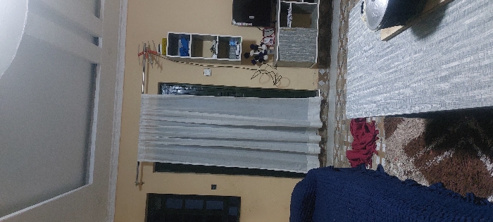 A room features a window with sheer white curtains. Above the window, a television is mounted with a cabinet. A wall-mounted shelf unit holds various items. A blue blanket rests on a textured rug with red fabric. A doorframe is visible on the left side of the room. The wall is painted in a neutral tone, adding to the overall interior.