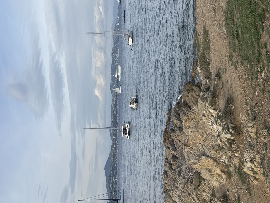 The image displays a coastal scene in the city of Saint-Tropez, France, likely within the Gulf of Saint-Tropez. In the foreground, the lower left quadrant features a rugged, light-brown rocky outcrop extending into the water, exhibiting visible geological stratification. Patches of sparse, dry vegetation and small amounts of green grass are present among the rocks and along the dirt path that comprises the lower right foreground. The midground is dominated by calm, blue-grey water with minimal wave activity. Several boats are present: - A white catamaran, identified by its twin hulls and central cabin, is positioned left of center. - A smaller, light-colored motorboat or tender with an outboard motor is located to the right of the catamaran. - A white monohull sailboat with a single mast and rigging is situated in the right midground. - Further left, part of another sailboat with a black hull and white mast is partially visible. - In the background, across the water, a large white superyacht is anchored or moving slowly, positioned right of center. - A white sailboat with its sail hoisted is visible to the left of the superyacht. - Multiple other small, indistinct boats are scattered across the water towards the distant horizon. A dark, possibly inflatable, dinghy or small craft is visible behind the white monohull sailboat. The background consists of a low mountain range or hills covered in dense green vegetation and scattered structures, indicating a populated coastline. The sky is overcast with a mix of grey and white clouds. No individuals or specific actions are discernible within the frame.