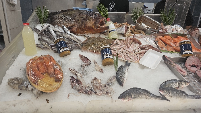 An overhead view captures a refrigerated display unit filled with crushed ice in a seafood counter located in Hydra, Algeria