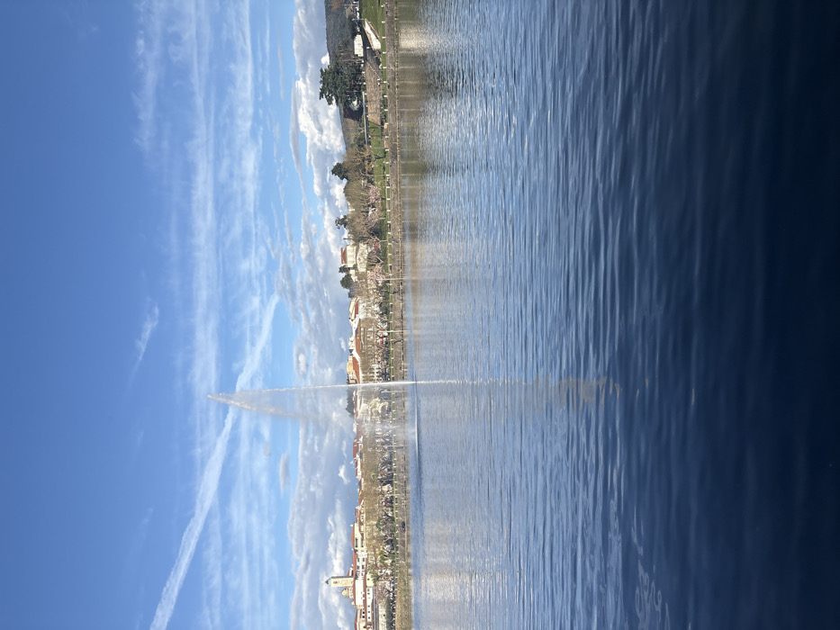 The image displays a daytime view of the city of Mirandela, Portugal, from across a wide body of water, likely a river or lake. In the foreground, the water surface exhibits ripples and reflects the sky and distant elements. A prominent water fountain is active in the center of the water, projecting a tall, narrow stream upwards, with its reflection visible below. On the opposite bank, a continuous line of buildings constitutes the city skyline. These structures predominantly feature light-colored facades and reddish-orange tiled roofs. To the left, a distinct, light-colored church tower with a domed top rises above the surrounding buildings. Along the waterfront, a developed embankment or promenade is present, featuring a row of trees, some appearing deciduous and bare, while others display early spring pink blossoms. Further in the background, to the right, green, undulating hills or mountains are visible. The sky is mostly blue with scattered white clouds, including wispy cirrus and fuller cumulus formations. Several distinct white contrails from aircraft are visible traversing the upper sky. No individuals or specific activities are identifiable within the scene.
