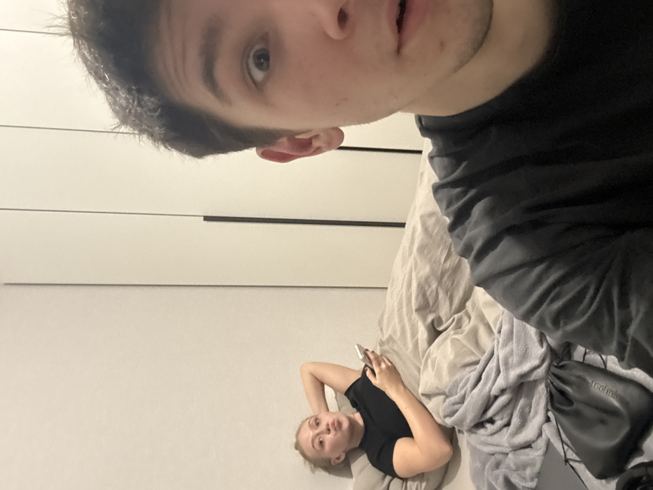 An indoor scene depicts a bedroom in Yanino-1, Russia. The foreground, positioned on the right side, shows a male individual from the upper torso, shoulder, and head. He has short, dark hair and wide-open eyes, wearing a dark short-sleeved shirt. In the mid-ground, to the left, a female individual is semi-reclined in a bed. She is covered by light beige bedding and a grey blanket, wears a black short-sleeved top, and holds a white smartphone in her right hand. Her left arm is bent with the hand behind her head, and her lips are pursed. The background features a light-colored wall behind the female and a white wardrobe with dark vertical handles to her right. A black drawstring pouch with faint white text is situated on the bed in the lower-left foreground.
