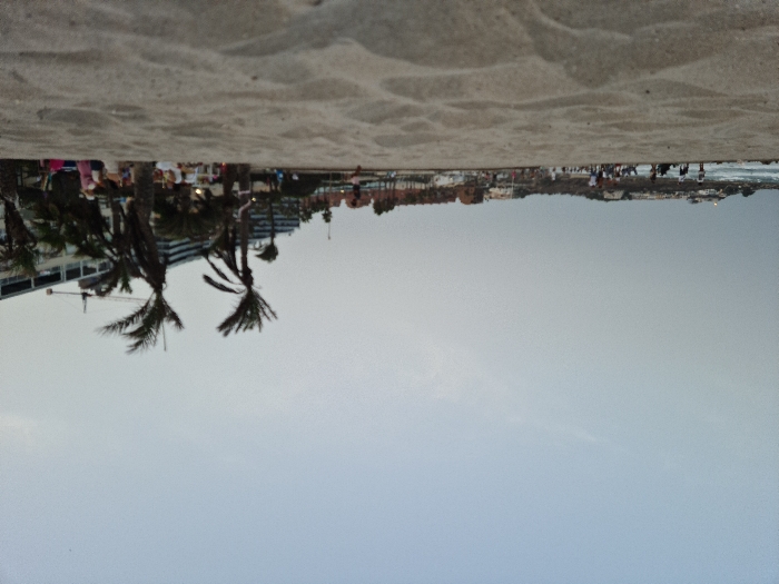The image displays a wide-angle view of Playa de San Juan in Alicante, Spain, captured from a low perspective on the sand. The scene is set during dusk or dawn under a uniformly light grey, overcast sky. The foreground consists of undulated, light-colored sand, occupying approximately one-third of the frame. In the midground, the Mediterranean Sea is visible on the left, showing minor wave activity near a rocky shoreline. Further left, a headland with discernible structures is present in the distance. Multiple groups of individuals are scattered across the sandy beach. On the left side, approximately 10-15 people are standing or gathered near the waterline and the edge of the rocky area. Towards the right, a cluster of 8-12 people is observed under or around a group of palm trees, with some individuals appearing seated on the sand. One person is in motion, running across the beach between these groups. The background features a continuous line of established palm trees. Behind these trees, multi-story buildings, consistent with hotels or residential complexes, line the beachfront. A large construction crane is visible above the buildings on the far right of the frame.