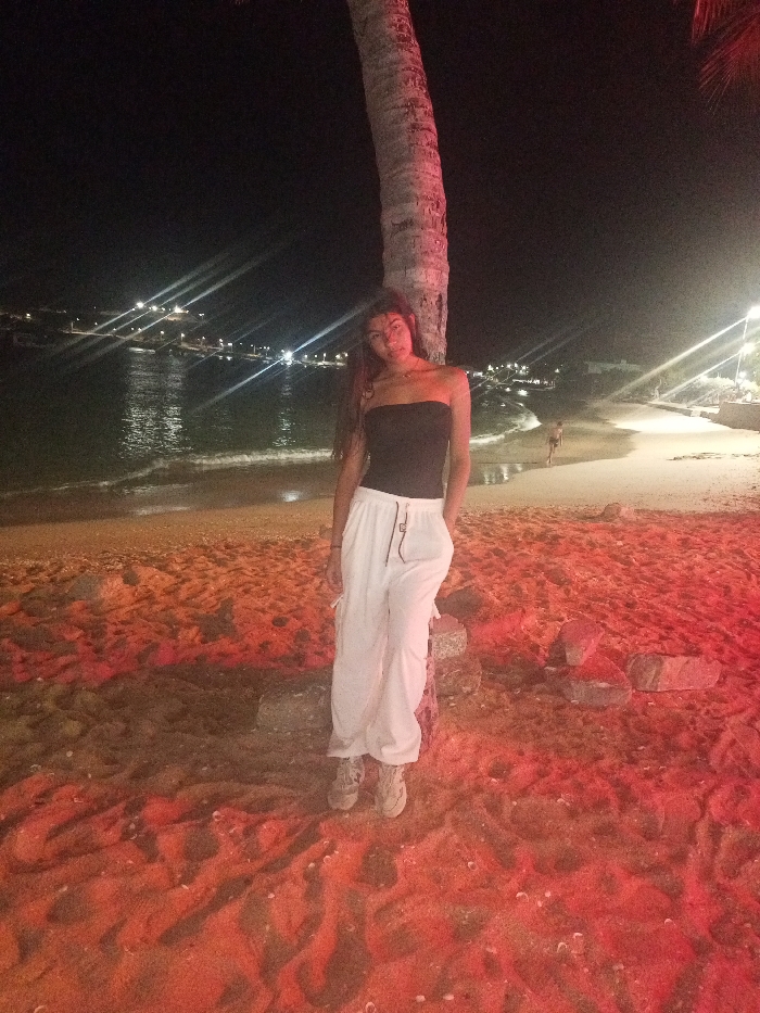 A young woman stands next to a palm tree on a beach at night. She wears a black strapless top and white pants. In the background, the sea meets the shore, illuminated by distant lights. The sand around the woman appears reddish, possibly due to the lighting conditions. A solitary figure is visible walking on the beach in the distance.