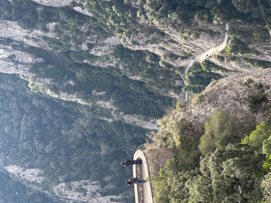 The image depicts a high-angle, panoramic view of a deep mountainous valley in Monistrol de Montserrat, Spain. In the lower left, a curved, stone-built observation deck with a light-colored capstone railing is situated on a rocky outcrop. Two individuals are present on this deck, both observed from behind. The person closer to the camera wears a blue top and dark trousers, holding a dark object (likely a smartphone) upwards, appearing to capture an image. The second individual, positioned further along the railing, wears a dark jacket and trousers, looking out over the valley. The surrounding terrain features steep, rugged gray rock formations and slopes densely covered with diverse green vegetation, primarily trees and shrubs. A winding, paved road is visible traversing the middle and lower sections of the valley. Small vehicles, appearing as light-colored rectangles, are present on this road, along with a few indiscernible pedestrian figures. Minimal man-made structures, possibly tunnels or small buildings, are discernible alongside the road in the distance. The background consists of further forested mountain ranges under natural daylight conditions.