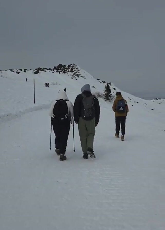 Three people are seen from behind, hiking up a snowy hill. The person closest to the camera is using hiking poles. All three have backpacks. In the distance, other figures are also hiking. The sky is overcast. The snow-covered hill leads up to a rocky peak.