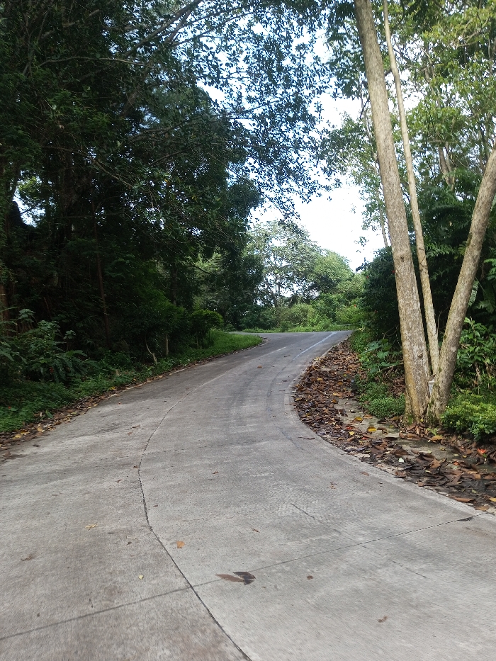 A concrete road curves gently through a dense forest